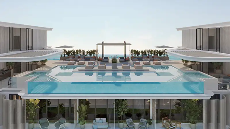 Luxury amenities including private beach club, spa, rooftop adults-only infinity pool, yoga deck, and steam & sauna