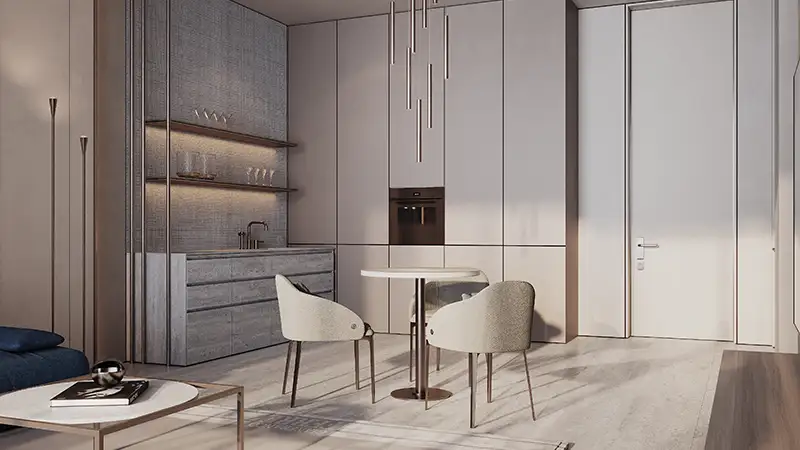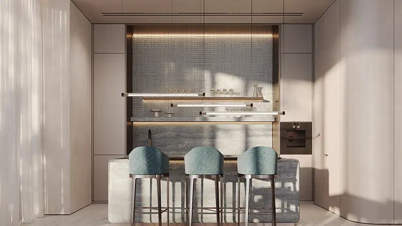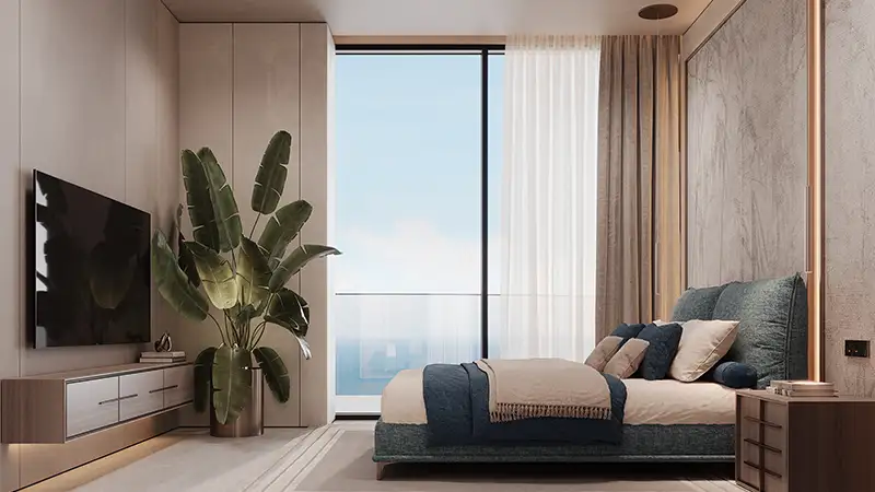 The interiors are meticulously designed with premium materials, harmonious color palettes, and impeccable finishes. Signature elements such as Canaletto walnut wood, bespoke fabric detailing, and luxurious textures elevate every living space — from elegant lounges and spacious bedrooms to refined hallways and private terraces. Every detail has been carefully selected to deliver an atmosphere of sophistication, comfort, and exclusivity.