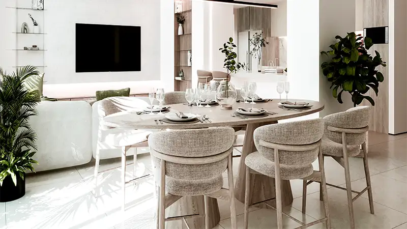 The grand entrance lobby sets the tone for sophistication, featuring bespoke detailing, curated art installations, and refined seating areas that reflect contemporary elegance. Each residence offers spacious open-plan layouts with defined dining areas and fully equipped modern kitchens. Private balconies and large windows ensure uninterrupted views while maintaining a sense of privacy and tranquility.
